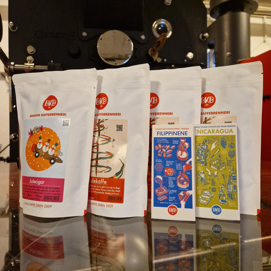 4 x 250g poser med unike kaffetyper, og BKB boken "K for kaffe"